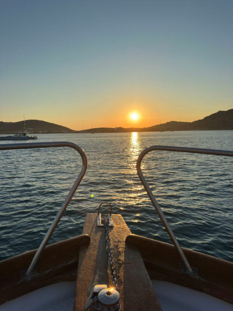 On the sunset tour, the captain chooses the perfect location to enjoy the changing colours of the Aegean — a calm, unforgettable moment at sea.