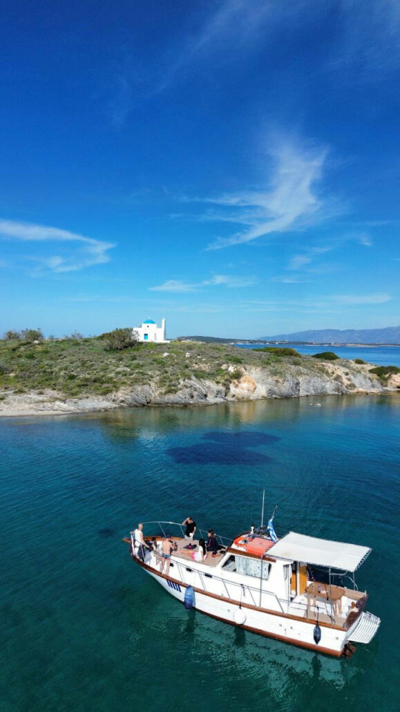 We continue to the small chapel of Agia Kali, built on a rocky islet and accessible only by boat, before heading to Lageri Beach, one of Paros’ most unspoilt swimming spots.